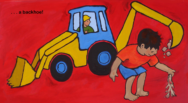 This is my sample illustration. After drawing the backhoe I tried giving it a different treatment--very flat--to indicate that it is not in the same "real" world as the child. I did this backhoe using PhotoShop.