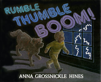 ![]() The story began years before it was finished. I had tried several versions of a story about being afraid of thunder, but none were satisfactory. I put them back in the drawer, thinking about them from time to time, working on them now and then, waiting for that idea that would suddenly make the other ideas work. Thats what stories are basically, ideas working together. One idea might be the inspiration for starting a story, but all by itself it cant be a story. A writer collects ideas, sometimes in her head, sometimes in a journal or notebook, sometimes on scraps of paper. I do all of those thingsnone in a very organized way. Those ideas rattle around, grow, combine in different ways until finally, there is a story. For Rumble Thumble Boom! the idea that finally helped came when our family made a big move across the country from California to Pennsylvania. Our first night there we stayed in an old ramshackle farmhouse, a little bit spooky all by itself with its tilting floors and curtainless windows. It got even spookier in the thunderstorm, so spooky that our eleven-year-old daughter Lassennormally quite independentended up in bed with us. Aha! There was the idea that let me finish the story. Another idea in the story came from another storm, years before. One hot August afternoon I was in the kitchen making blackberry jam when a storm came up. I reassured Lassen who was then four years old and trying to be brave. She went into the living room, taking our dog Mushka. Like a lot of dogs Mushka was anything but brave in a thunderstorm. Dont worry, Lassen said. It wont hurt you, Mushie. Its just the air bumping into itself. A particularly loud clap of thunder brought them both scurrying to my side. Lassen, wide eyed, but still not admitting her nervousness, looked up at me and asked, Do you need me to help you? The illustrations were different than any I had done before because the story takes place at night. The darkness is very important. I did several samples using water color, some with a colorful under-painting, then a dark wash over top which I scrubbed back through for the highlights. I planned for the thunder sounds and text to be light on dark. I sent these experiments to the editor and art director. They said, Too dark. They thought it would be better to have the text dark on light and a white border around the pictures. I did some more samples and this time they said, Too light. The art director suggested that I start with black paper and work to light, so I did, using a combination of aquarelle pencils for washes, and other colored pencils. Those samples they liked. Id had to do a bit of work to get the people and scenes right, too.