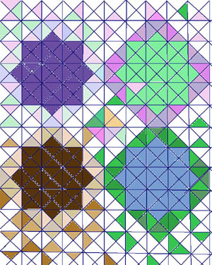 Here is my computer design for this quilt. It was the first time I tried designing on the computer and as you can see I wasn't very good. I'm still not REALLY good, but I'm getting better. I'm designing a lot of the quilts for my next book on the computer. It is a good way to experiment with color and check out a lot of possibilities before I cut the fabric. Do you want to design a quilt using half-square triangles in a program such as Corel Draw, Paintshop Pro, PhotoShop or others that let you "fill" spaces with colors? Download this jpeg grid file, open it in your software program and have fun! |
