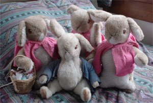 ![]() ...and Flopsie, Mopsie, Cottontail and Peter from The Tale of Peter Rabbit. These patterns are from Margaret Hutchings, Toys from the Tales of Beatrix Potter. Most of these dolls and animal characters were given as gifts to my daughters and my mother. |
