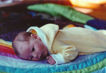 | When our third baby was coming I wanted to involve the two older girls in the preparations. We decided to make a quilt for the baby. The girls drew designs and together we came up with our pattern which we appliquéd using calico prints. Again the quilting is minimal, but this time it was all done by hand. |