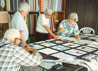 I wrote to my sister Nelda to ask what she thought. She asked the others, Mom has five of us plus our spouses and children, and all agreed to do it and to invite Mom's siblings and quilting friends to participate as well. Mom had continued to meet and quilt with the friends she had made in the class. I knew a couple of first names. Nelda found out which store had sponsored the class and got the phone number of one member of the group, who sent us a list of names and addresses of six who would like to participate.