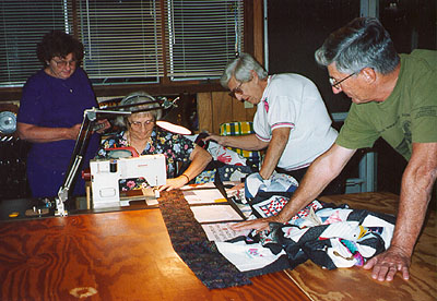 Aunt Esther and Uncle Bob cut sashings. Uncle Walter, another of Mom's brothers and his wife came for the afternoon and helped supervise. Aunt Fran sewed and Aunt Betty pressed. Along with giving her input, Lassen worked on a scrapbook which includes a copy of each square and anything its creator sent along about it, as well as all our correspondence and notes, Uncle Bob's chart and so on. By Saturday evening three strips were put together.