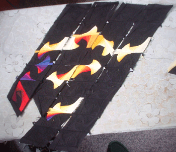 I'll do the same thing along both sides, add my backing fabric, thin blue, and wide black borders and I'm done.