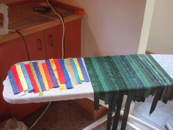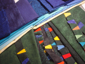 I started by sewing strips of green and brights for the tree. Here I'm trying the blue background colors, the light blues and pale yellow halo colors and the tree colors. I think it will work.